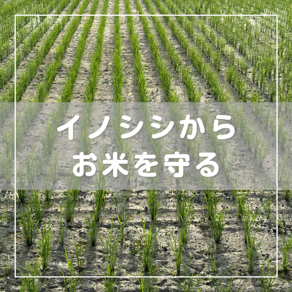 知り合いの農家さんが何かしていたので声をかけると、イノシシよけを設置中とのこと。「あそこのあぜのとこ、足跡あるよ」「水のある田んぼにも入るんです…
