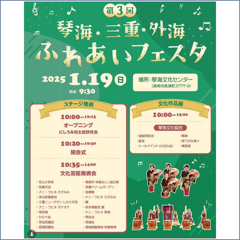 19日に「琴海・三重・外海ふれあいフェスタ」が琴海文化センターで開催されます! ステージで行われる文化芸能発表会では、昨年11月開催の「外海ふれあい広場」で好評だったデュオ…