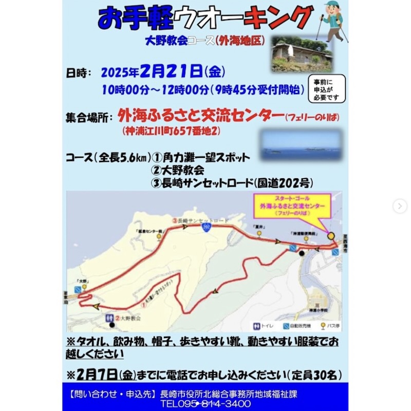 外海のまち歩きをしてみませんか? フェリー乗り場のある神浦港から大野教会へぐるっと周回する5.6キロのコース。2時間設定なので、それほど苦しくなく歩け…