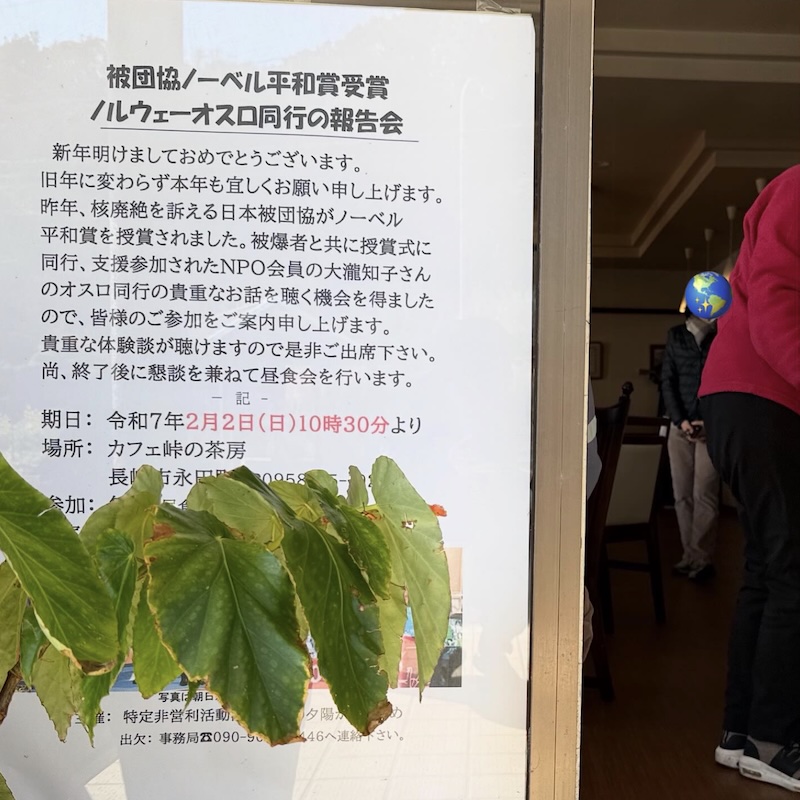 日曜日の午前中、「タネト」に行く前の時間、外海にある「NPO法人夕陽が丘そとめ」の平さんにお誘いいただき、ノーベル平和賞授賞式の報告会に参加しました。登壇者は大瀧知子…